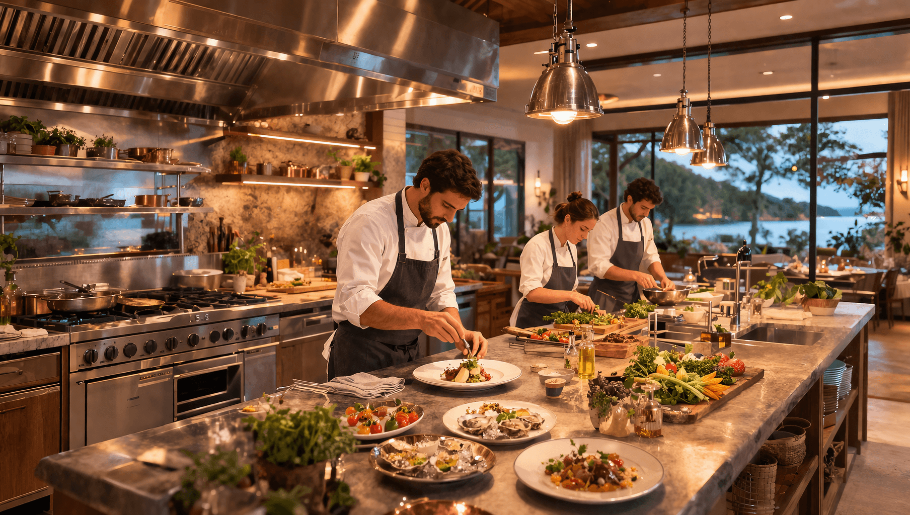 Visiting chefs, resident mentors, and apprentices move through the space together—cooking, testing, refining. Techniques are passed hand to hand. Recipes are not fixed; they evolve, shaped by the season, by the land, by the people in the room. Ingredients come from nearby soil and surrounding waters, grounding everything in a true farm-to-table practice that is both disciplined and alive.